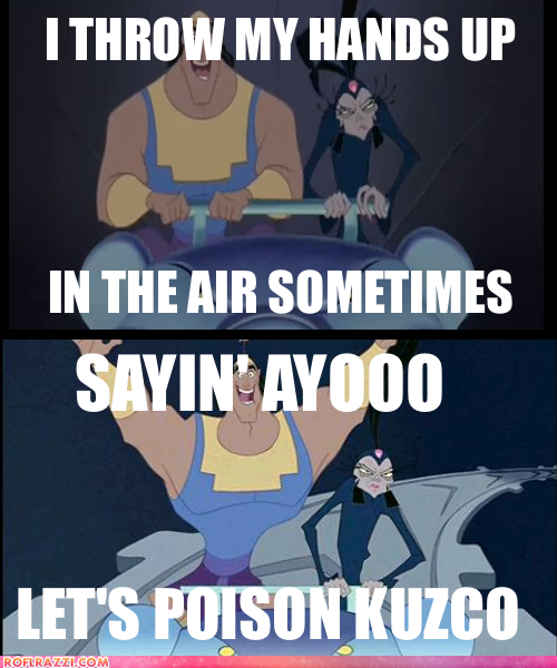 I throw my hands up in the air sometimes sayin' ayooo, let's poison Kuzco. -Disney