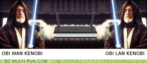 Punmaster megmond says: "The Kenobi family got into the networking business recently. Obi WAN and his brother Obi LAN founded the company, and Obi WLAN joined just recently selling hot air in the marketing department."