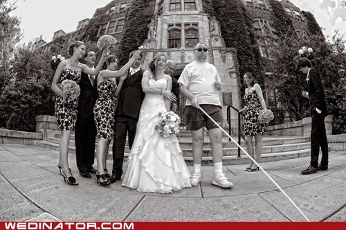 we were facing the photographer and this blind man coming out of the buiding behind us literally plowed into me and over my dress. apparantly that cane doesn't work as well as expected in detecting obstacles like an entire wedding party in one's path!You know, I don't usually do this but this submitter's commentary made me cringe. HE'S BLIND. You are blessed with the infinitely wonderful gift of sight. So he ruined one of your sho