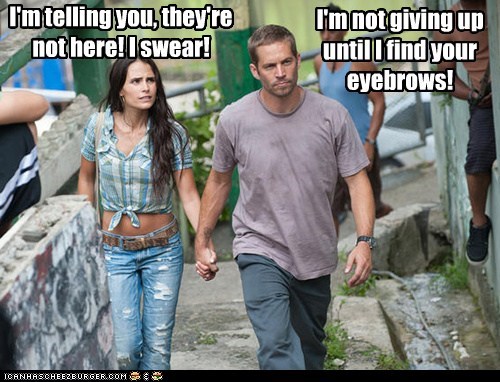 I'm telling you, they're not here! I swear! I'm not giving up until I find your eyebrows! -Paul Walker