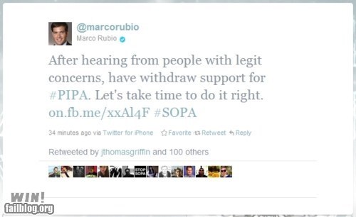 Anti-Censorship Win of the Day: In a major victory for the Internet, and major blow to its would-be censors, Sen. Marco Rubio (R-FL), co-sponsor of SOPA's sister bill PIPA, has officially withdrawn his support for the legislation.