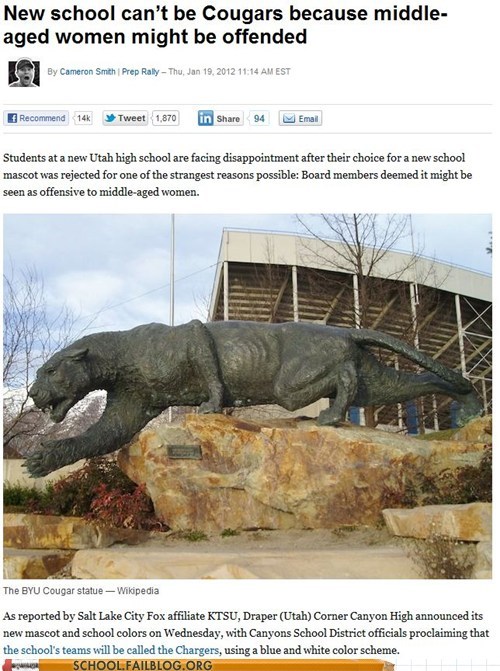 Even though the student body voted to have their mascot be the Cougars, the Canyons School Board refused it on the grounds that it would be offensive to older women. Is this oversensitivity to slang words, or is the board being threatened by some Courtney Cox-wannabes?