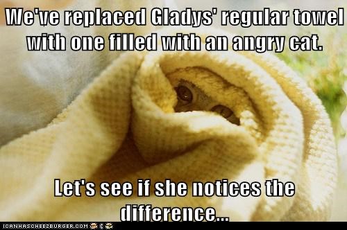 We've replaced Gladys' regular towel with one filled with an angry cat. Let's see if she notices the difference...
