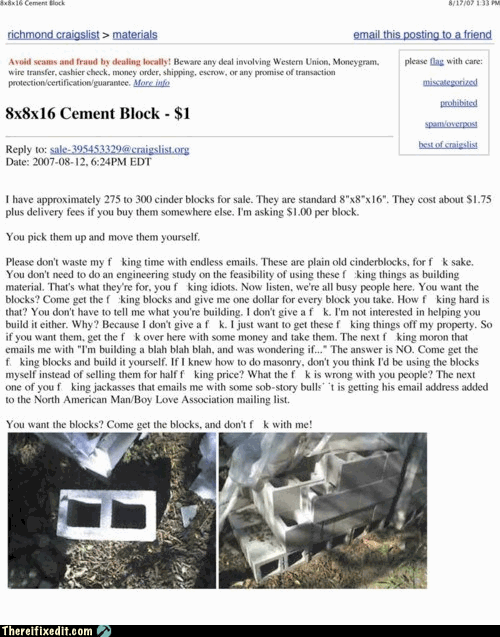 This guy totally looses it while posting the details of his Craigslist ad about selling used cinder blocks. Clearly this many has sold too many cinder blocks in his time, as well as dealt with way too many Craigslist buyers looking for discount cinder blocks.