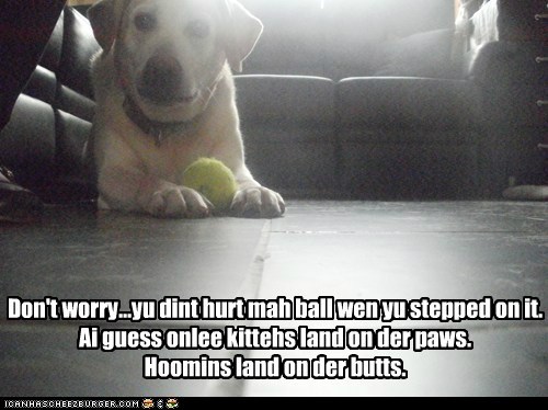 Don't worry.. yu dint hurt mah ball wen yu stepped on it. Ai guess onlee kittehs land on der paws. Hoomins land on der butts.