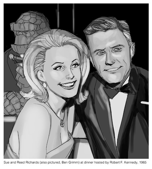 "From the Hank Pym Photo Archives- "So Reed and Sue decided to throw a dinner party to welcome the Attilan Royal Family to New York. It was quite the to-do. Just about everyone in the hero circle was there. Black Bolt, Medusa, et al. were a bit surprised I suspect, but very appreciative. I got some nice shots of the budding romance between Medusa's sister, Crystal and Johnny Storm. I think Sue may have introduced them before but the "sparks" were definitely flying that night.