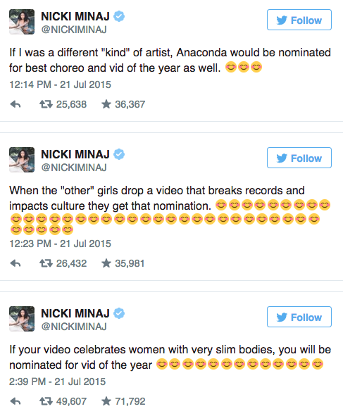 Nicki Minaj tweeted her ~feelings~ about not being nominated for a best choreography VMA.She's real mad. Just look at all those sarcastic smiley emojis.