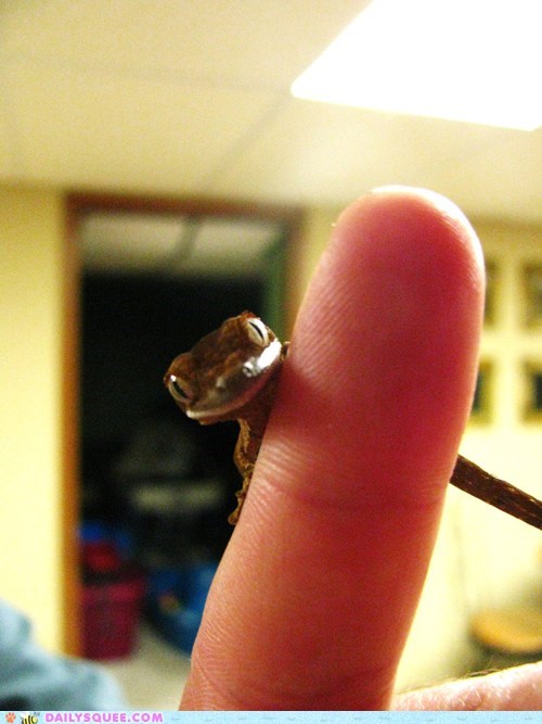 I know I'm certainly surprised to see you! I mean, I know we share the same apartment, but I wasn't expecting you to be home from work already! I was just taking a nap in my terrarium, and all of a sudden I woke up to see this finger in front of me and I had the craziest urge to climb it! And then BAM! There you are, right at the end of the finger! Does that mean this is your finger? That would make sense, I guess.
