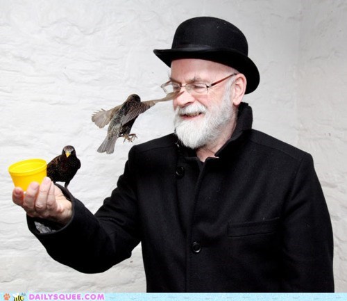 YES. THIS IS A REAL PHOTO THAT IS COMPLETELY REAL. TERRY PRATCHETT IS A BIRD WHISPERER AND I'M NOT EVEN A LITTLE BIT SURPRISED.