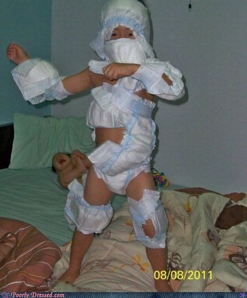 The little ninja brother doesn't look too pleased about the big ninja's attire.