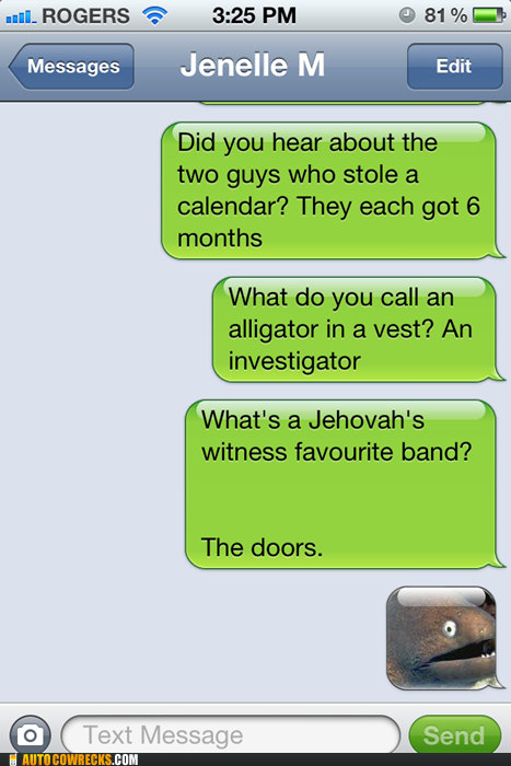 Bad joke eel wasn't for-tuna-te enough to text somebody who appreciated his terrible sense of humor.
