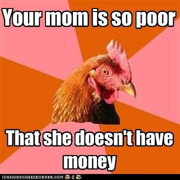 Your mom is so poor that she doesn't have any money.
