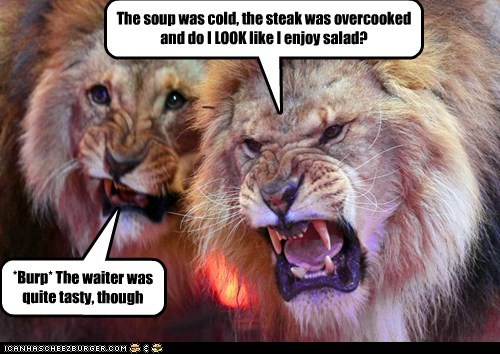 The soup was cold, the steak was overcooked and do I LOOK like I enjoy salad? Burp The waiter was quite tasty, though