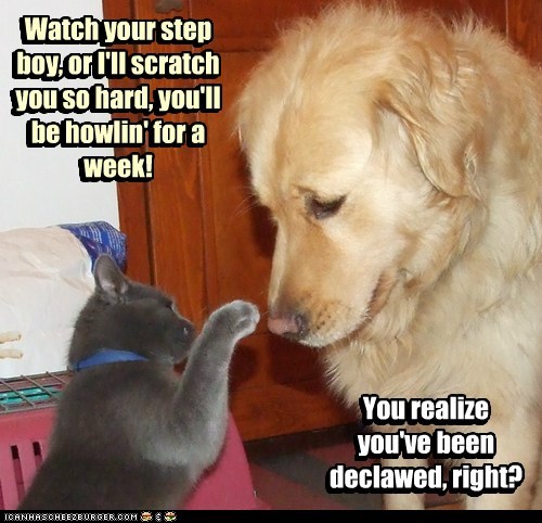 Watch your step, boy, or I'll scratch you so hard, you'll be howlin' for a week! You realize you've been declawed, right?