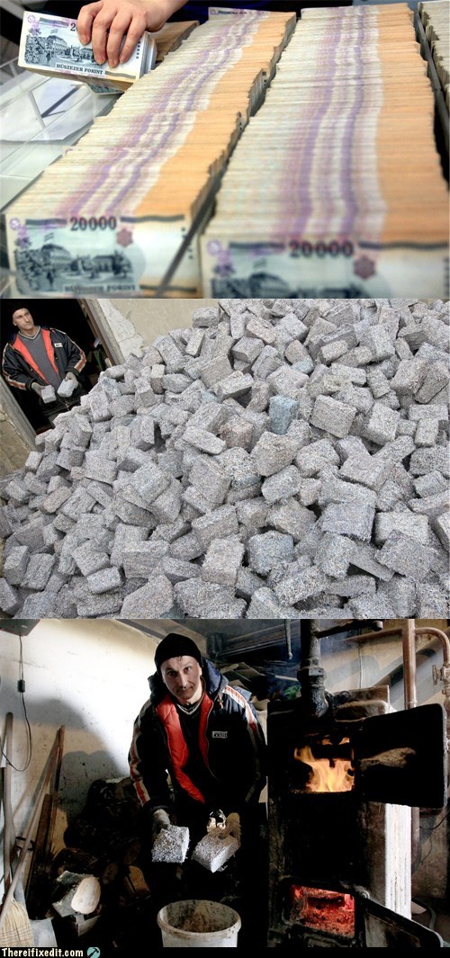 The Hungarian Forint is used in very large quantities ($1 USD = 218 Ft) so the government recycles a few tons of it every year. After shredding it and bundling it into bricks, the currency is shipped to charitable organizations to help with their heating cost.