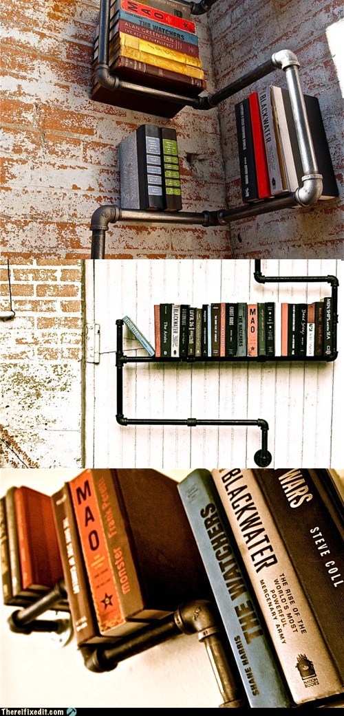 Etsy merchant Stella Bleu Designs uses vintage looking pipes to create beautiful looking bookshelves. Perfect for a steampunk home (preferably with lots of studs).