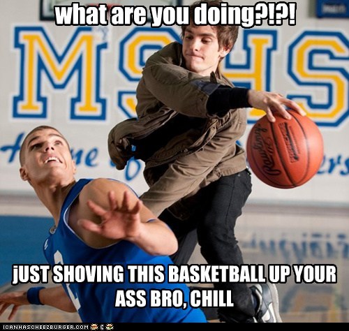 What are you doing??!? Just shoving this basketball up your ass bro, chill -Andrew Garfield