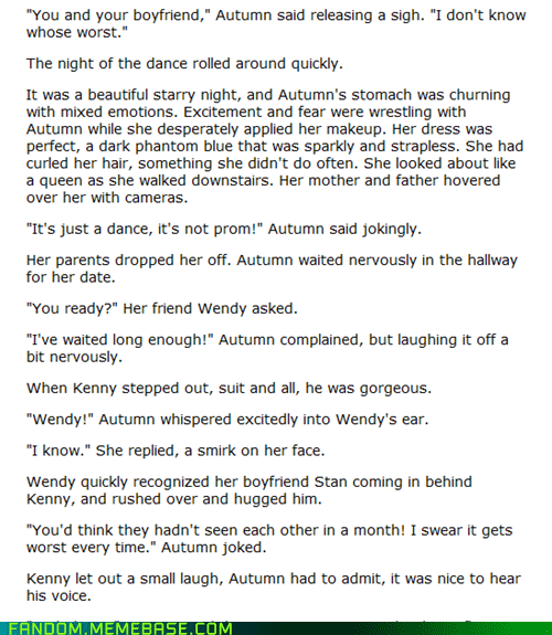 Things that creep me out #257: dramatic South Park romance fanfiction. There are few characters in my mind that are less suited for romance than the boys from South Park and "OMG, Autumn loves Kenny" just makes me cringe. I can't decide if my favorite quote from this fanfic is "Autumn could barely sleep that night. Her Ashley Tisdale poster seemed to be smiling at her, Hannah Montana seemed like she was dancing with her" or "I know we've only been together for a little while, but Jack and Rose were only together for a day or two. I love you." Read it for yourself and let me know what your favorite moments were in the comments. Link to the full story in the via below!