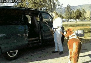 While some folks like to get big ol' wagons to drag around their horses in, this rider simply slides open the mini van and giddyap those hooves inside