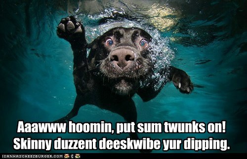 Aaaww hoomin, put sum twunks on! Skinny duzzent deeskwibe yur dipping.