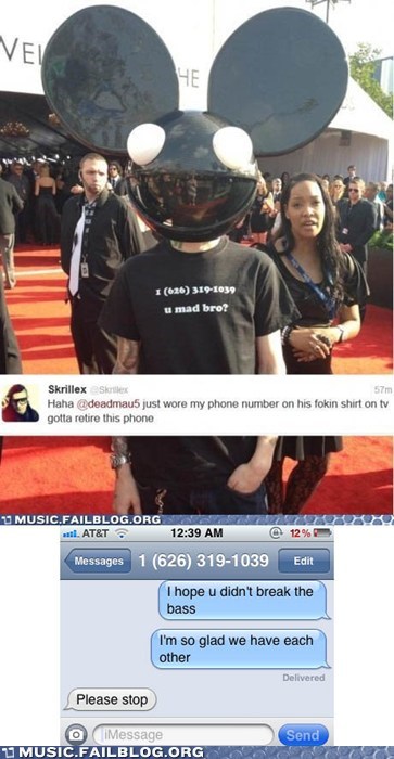 Deadmau5 broadcasted Skrillex's phone number on his t-shirt at the Grammy's?