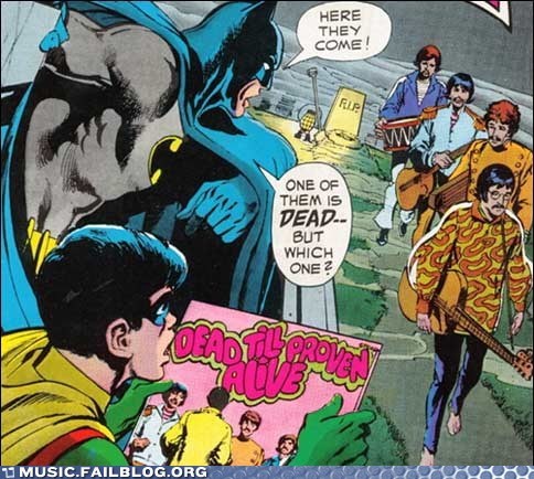 This is from an actual 1970 Batman comic book, in which the Dark Knight takes on the "Paul Is Dead" conspiracy theory. Unfortunately, DC couldn't legally write The Beatles into their story, so instead they substituted a fictional band called the "Oliver Twists," formed by bandmembers "Glennan," "Saul," "Hal," and "Benji."