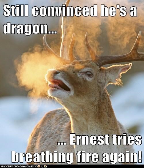 Still convinced he's a dragon... ... Ernest tries breathing fire again!