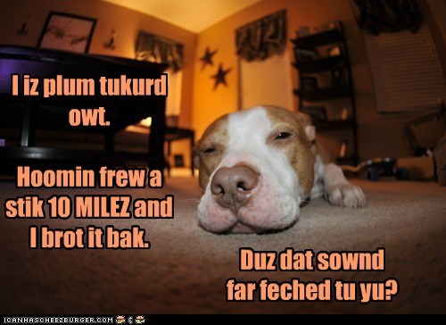 I iz plum tukurd owt. Hoomin frew a stik 10 MILEZ and I brot it bak. Duz dat sownd far feched tu yu?