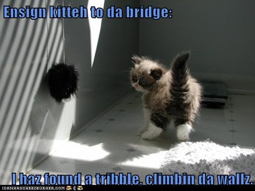 Ensign kitteh to da bridge: I haz found a tribble, climbin da wallz.