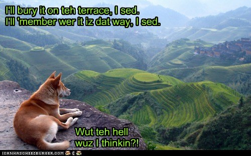 I'll bury it on teh terrace, I sed. I'll 'member wer it iz day way, I sed. Wut teh hell wuz I thinkin?!