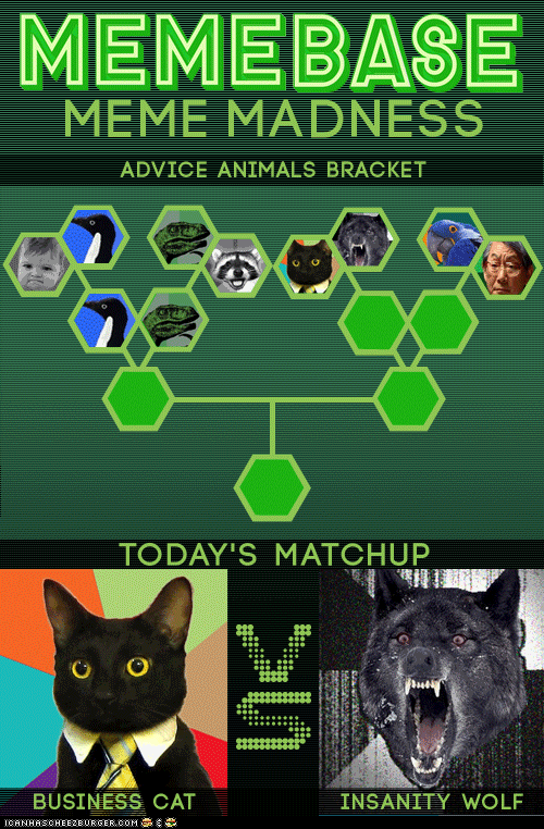 Ohai, Cheezfrends! Memebase's Meme Madness continues, and today, Business Cat needs your help! (Unless you prefer Insanity Wolf, which is totally valid... but our guess is that Business Cat is your guy!)