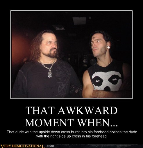 THAT AWKWARD MOMENT WHEN... that dude with the upside down cross burnt into his forehead notices the dude with the right side up cros in his forehead.