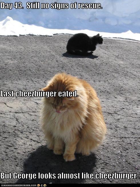 Day 43. Still no signs of rescue. Last cheezburger eated. But George looks almost like cheezburger..