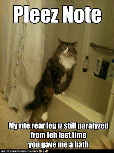 Pleez Note My rite rear leg iz still paralyzed from teh last time you gave me a bath