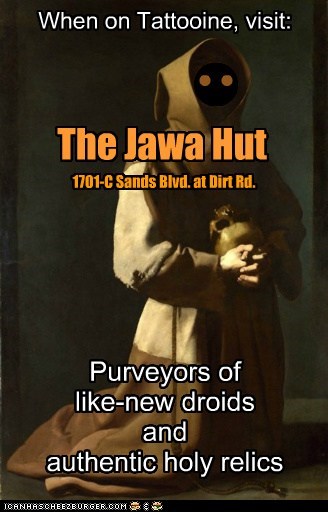 When on Tattooine, visit: The Jawa Hut 1701-C Sands Blvd. at Dirt Rd. Purveyors of like-new droids and authentic holy relics. -Star Wars Here be LOLs most amusing and historic!