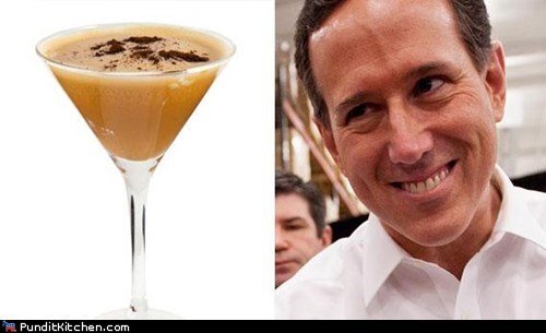 Short on ideas for hosting your next Republican Primary party? Might I suggest the Santorum? It's a frothy mixture of Baileys, orange vodka, bitters, and chocolate flakes, which is the byproduct of being a ridiculous candidate.