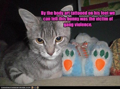 By the body art tattooed on his feet we can tell this bunny was the victim of gang violence.