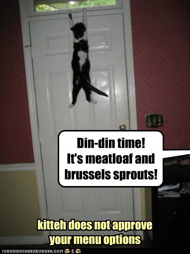 Din-din time! It's meatloaf and brussels sprouts! kitteh does not approve your menu options