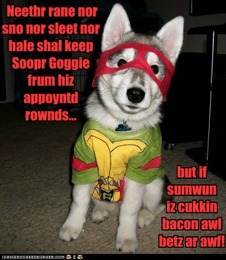 Neethr rane nor sno nor sleet nor hale shal keep Soopr Goggie frum hiz appoyntd rownds... but if sumwun iz cukkin bacon awl betz ar awf!