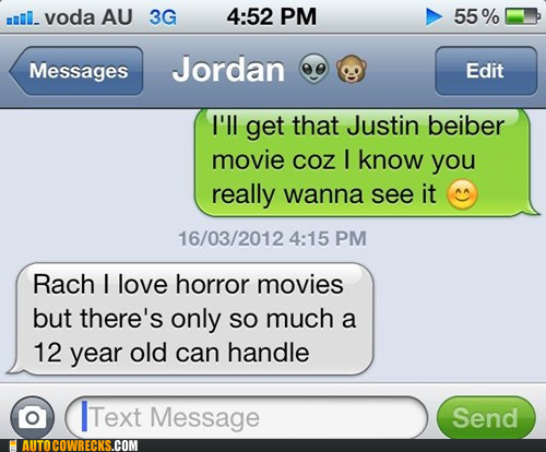 Trying to find a good horror movie to rent out to watch with my 12 year old sister one night, and I was texting her to help me decide what to get.