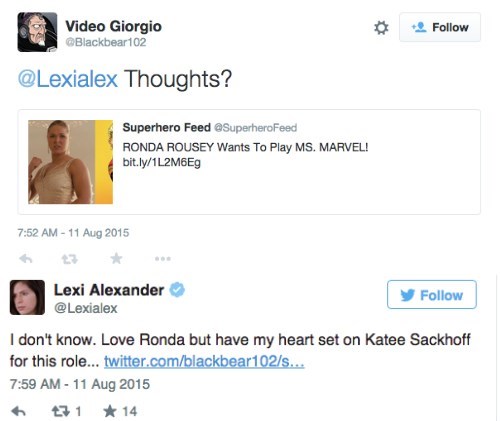 Ronda Rousey would make an interesting choice for Captain Marvel. I mean the lady is a total bad ass, but Alexander is a more traditional Nerd. -
