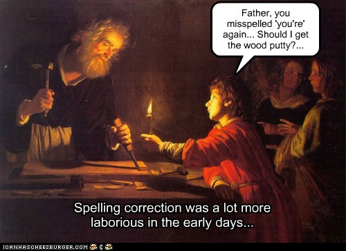 Father, you misspelled "you're" again... Should I get the wood putty? Spelling correction was a lot more laborious in the early days...