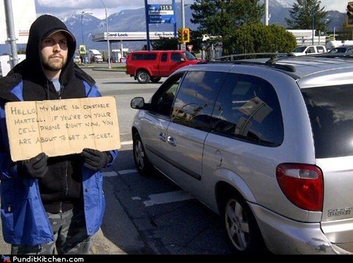 (His sign reads: "Hello my name is Constable Martell. If you're on your cell phone right now, you are about to get a ticket.")