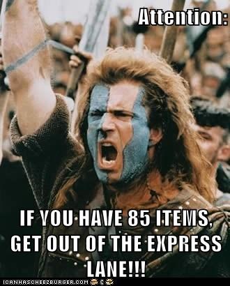 Attention, if you have 85 items get out of the express lane!!! -Mel Gibson