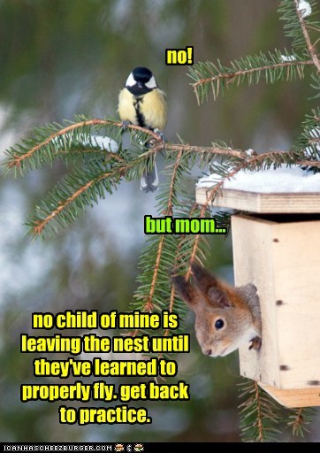 No! But mom... No child of mine is leaving the nest until they've learned to properly fly. Get back to practice.