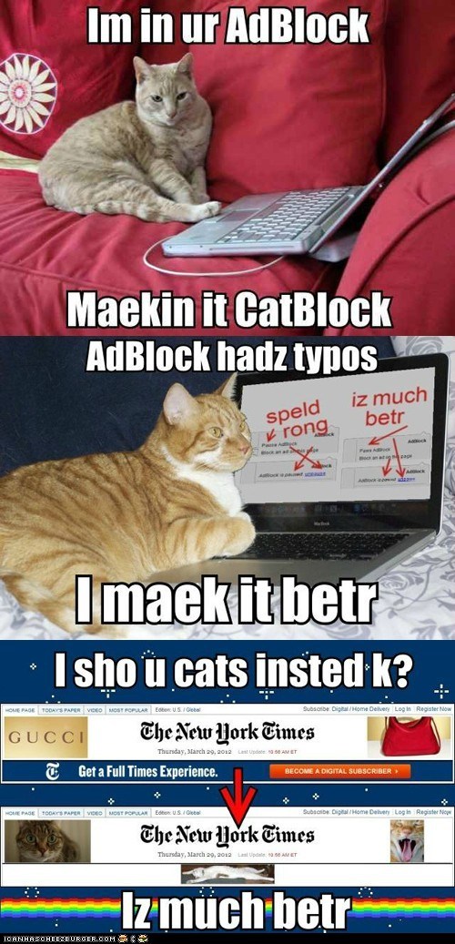 On April Fools' Day, if you have AdBlock installed on your browser, you may have noticed that the intertubes were clogged with even more kittehs than usual. This is because AdBlock replaced all ads with images of KITTEHS, becoming CatBlock (if only for a day). As good of a prank as this was, it's almost depressing because it should be this way forever.
