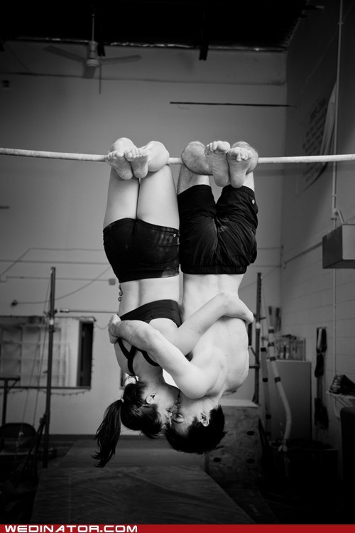 this is from our engagement photo session. i'm an aerialist in cirque du soleil, and he's a gymnast. this was taken one week before i left on tour, sadly leaving him at home. at our wedding, we plan to walk down the aisle on our hands after we say "i do."