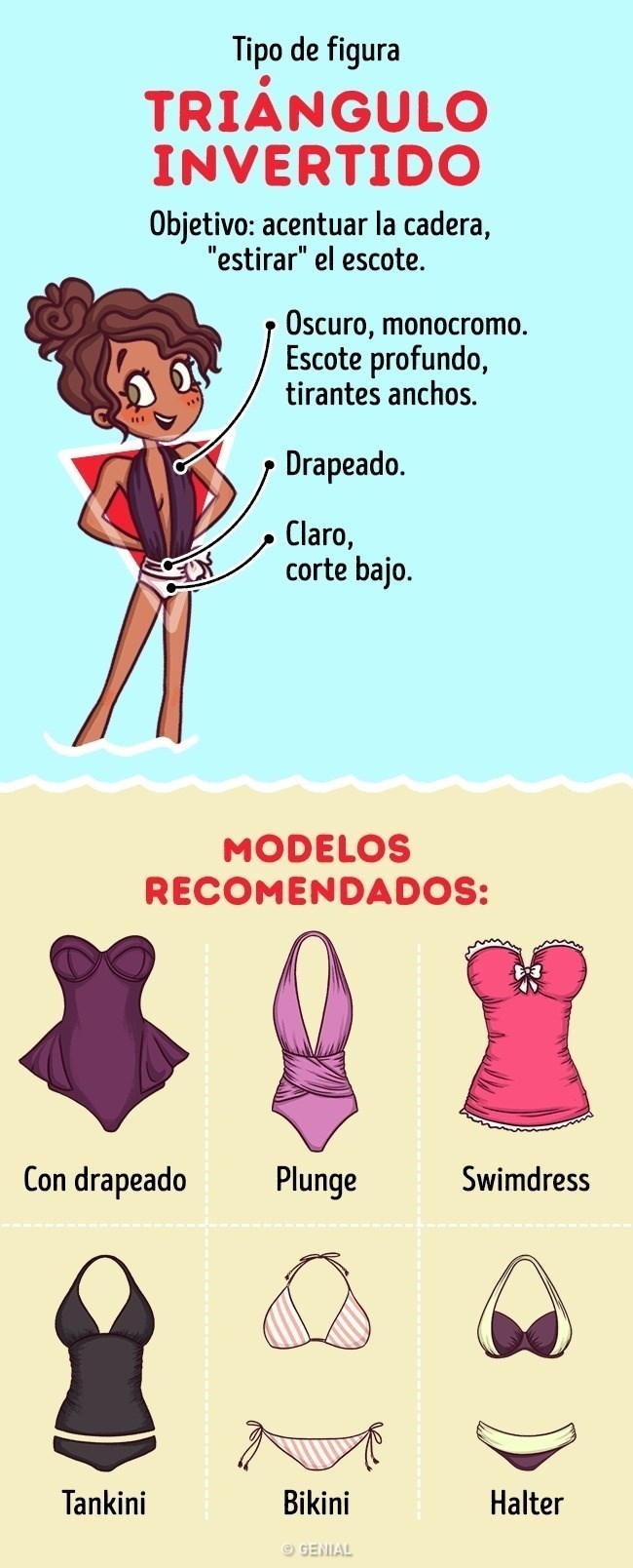 No hay mala figura sino un mal vestido de baño. Para lograr el efecto que buscas, hay que saber comprar el bikini que vaya de acuerdo con tu figura.