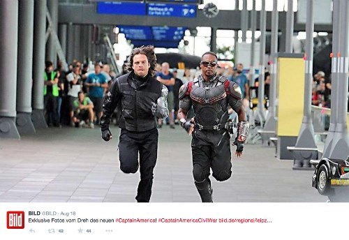 Here's Bucky Barnes and The Falcon, Captain America's best friends and (if the rumors are true) two of his staunchest allies in Civil War running for their lives on the set of Marvel's next big movie. You know what? It kinda looks familiar...