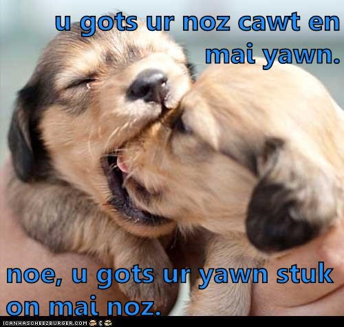 U gots ur noz cawt en mai yawn. Noe, u gots ur yawn stuk on mai noz.